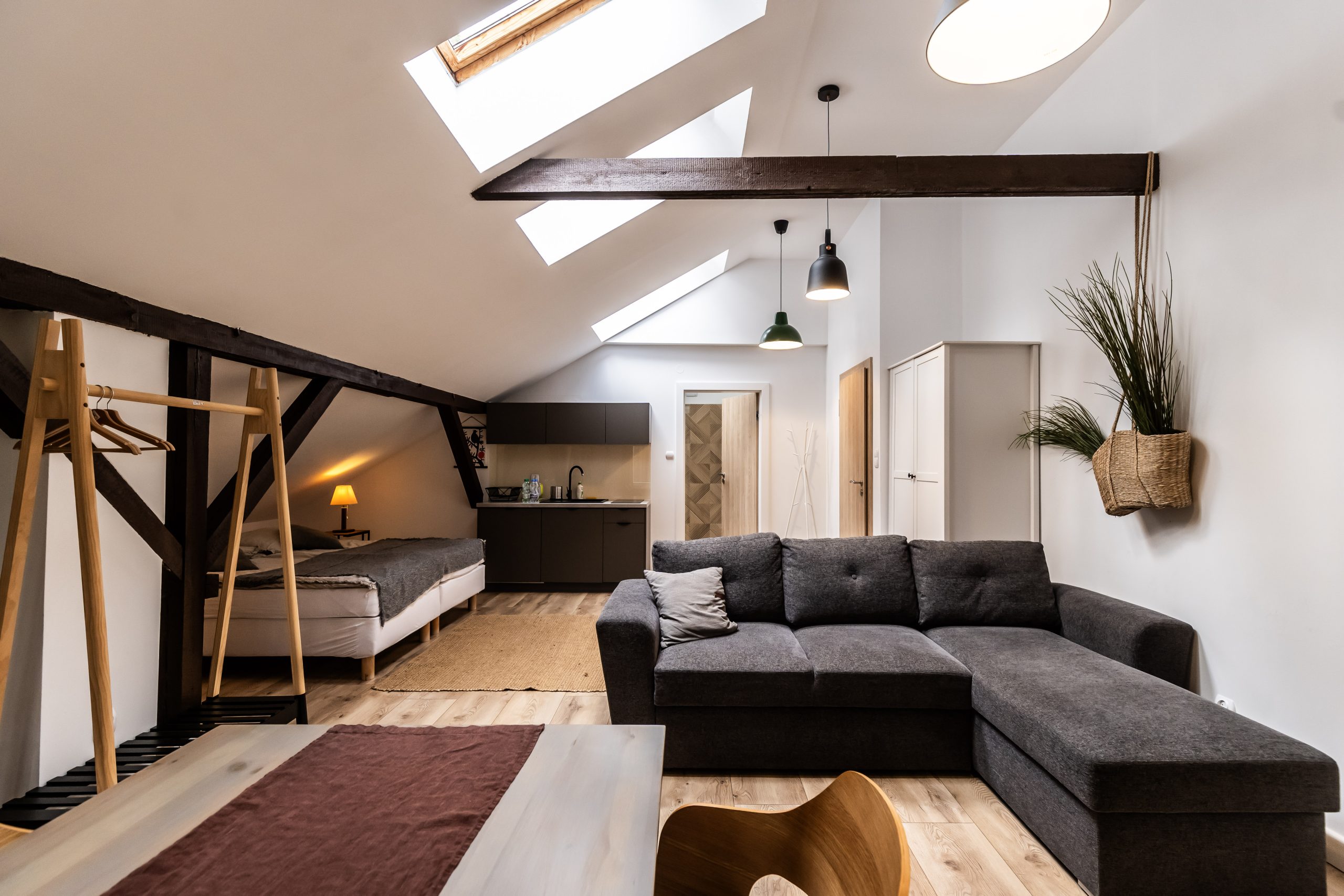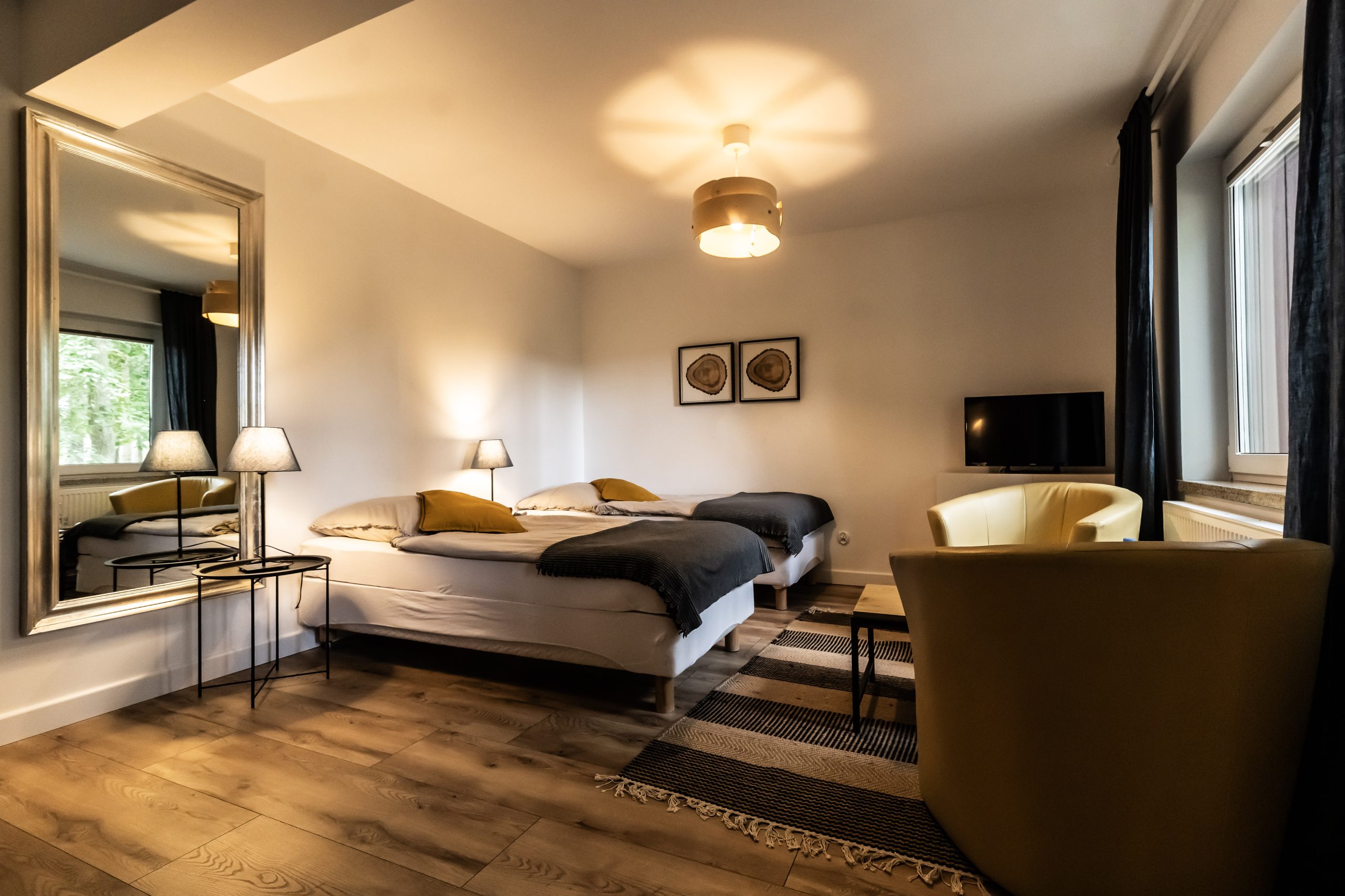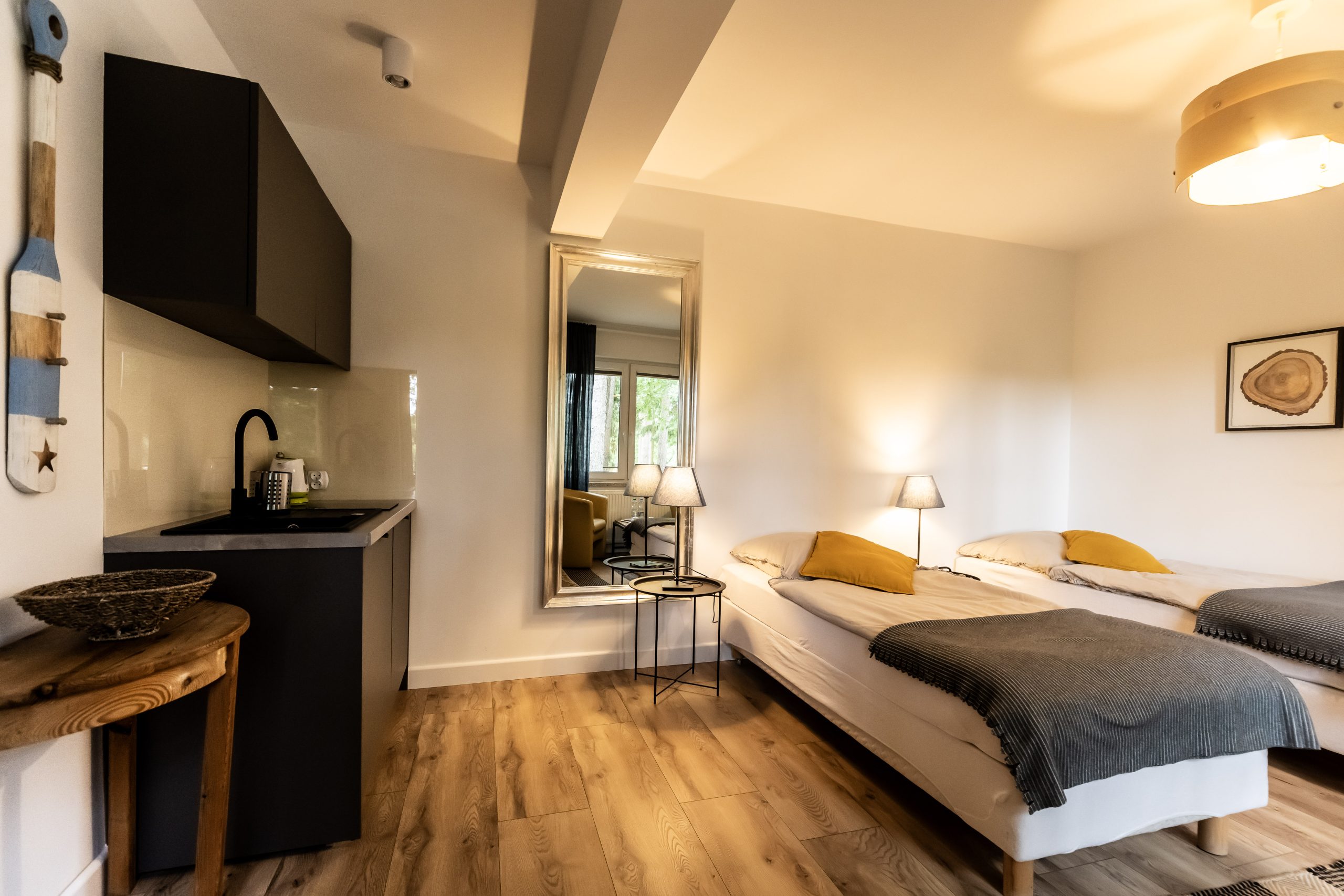 Dysponujemy przestrzennymi i funkcjonalnymi pokojami typu studio, wyposażonymi w aneksy kuchenne oraz dwupokojowymi apartamentami. Nasi goście mogą również wybierać między pokojami typu komfort i standard. Oferujemy gościom 19 pokoi, w których możemy ugościć 50 gości. Pokoje są przystosowane do pobytu dla 2, 3 i 4 osób.