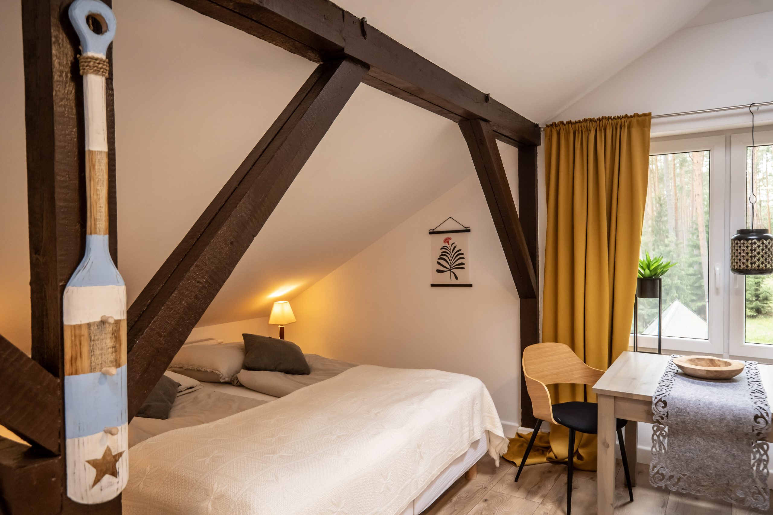 Pomieszczenia posiadają piękne widoki na las lub jezioro i wyposażone są w chłodziarkę, szafę typu komandor. W łazienkach są suszarki do włosów, komplety ręczników i zestawy kosmetyków.