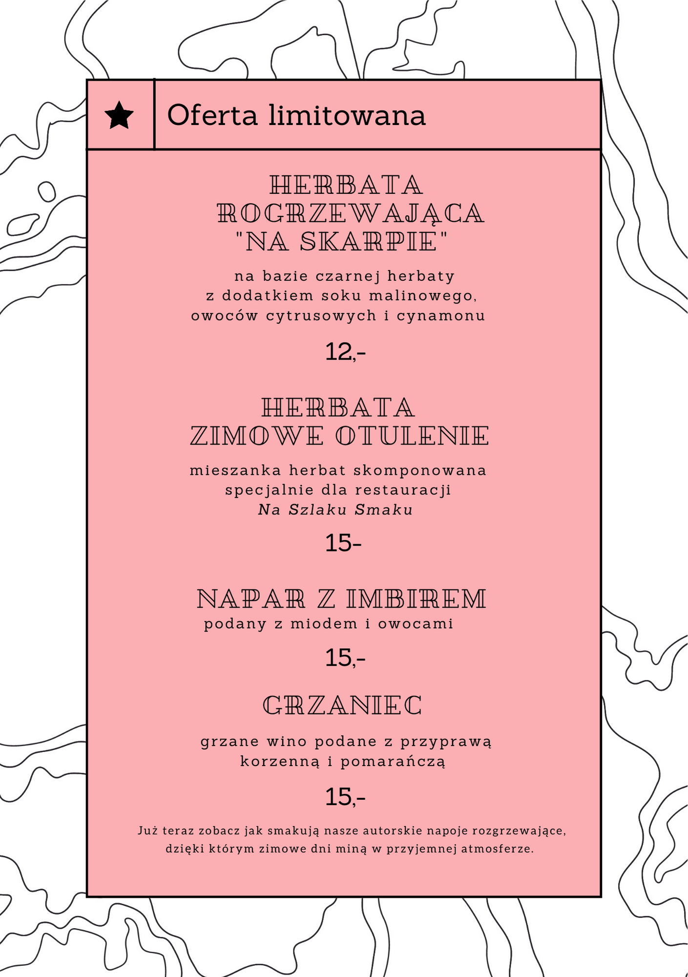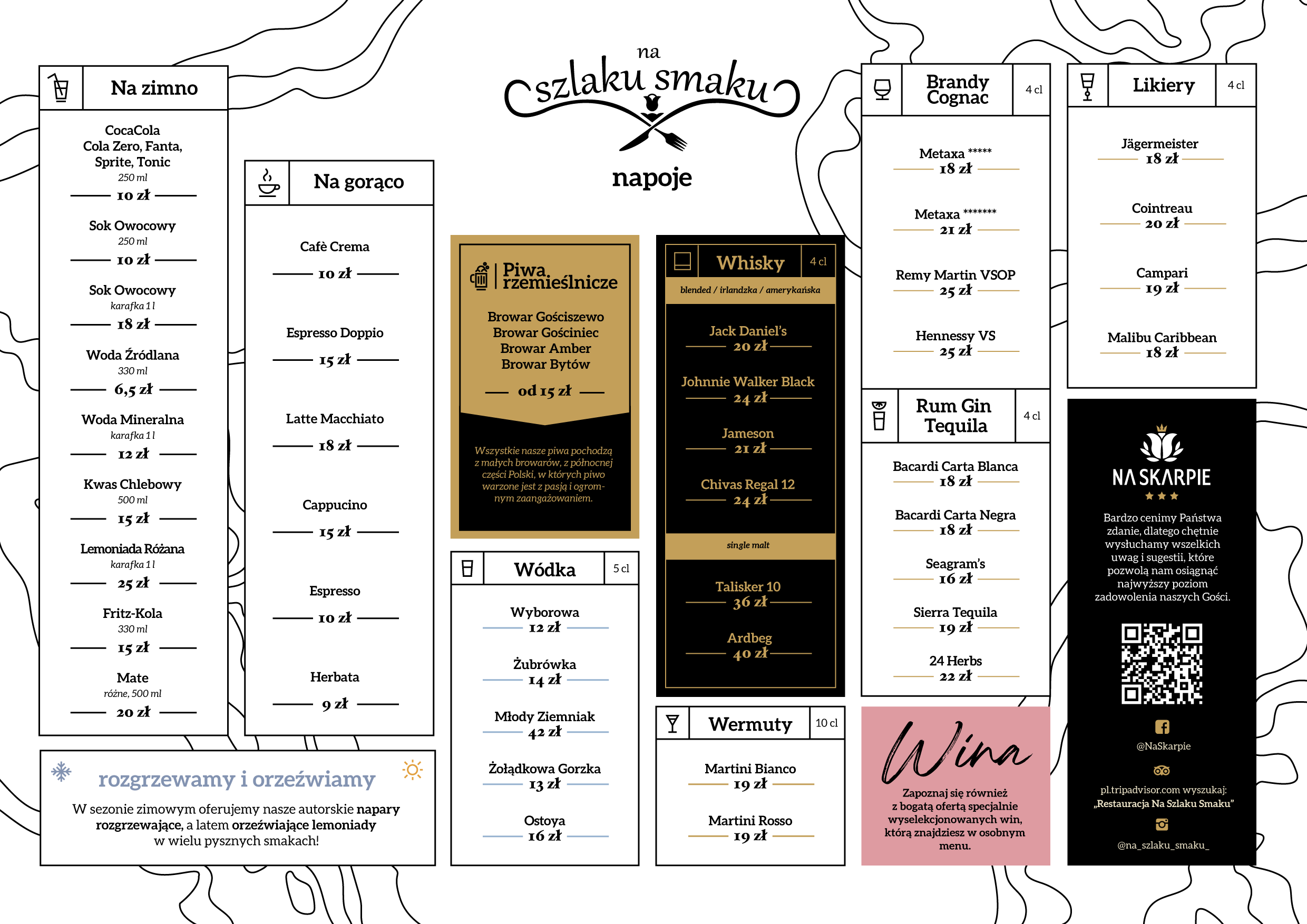 Ciekawym punktem na szlaku naszej karty są napoje. Latem przygotowujemy autorskie lemoniady , a zimą rozgrzewające i aromatyczne herbaty. Na stałe zagościły regionalne browary i warta uwagi oferta starannie wyselekcjonowanych win, dopasowanych do naszych potraw.