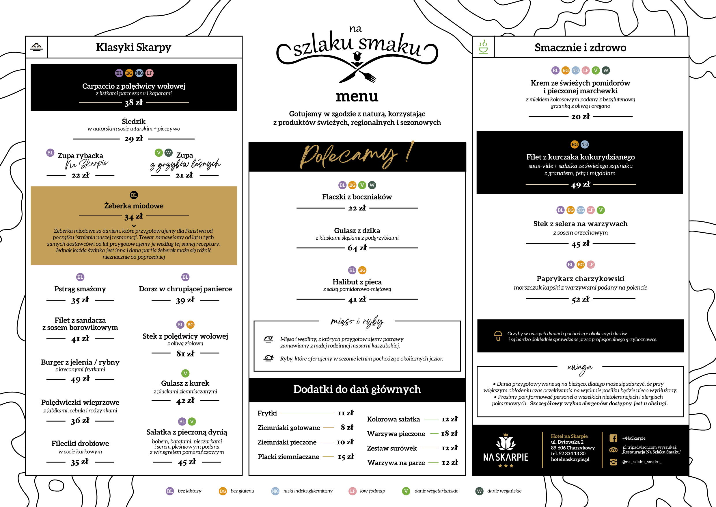 Restauracja Na Szlaku Smaku to kulinarna wyprawa przez specjały pór roku. W okresie letnim przewagę stanowią ryby z okolicznych jezior, a jesienią i zimą szlachetne borowiki z Borów Tucholskich, które tworzą idealną parę z naszym sandaczem.